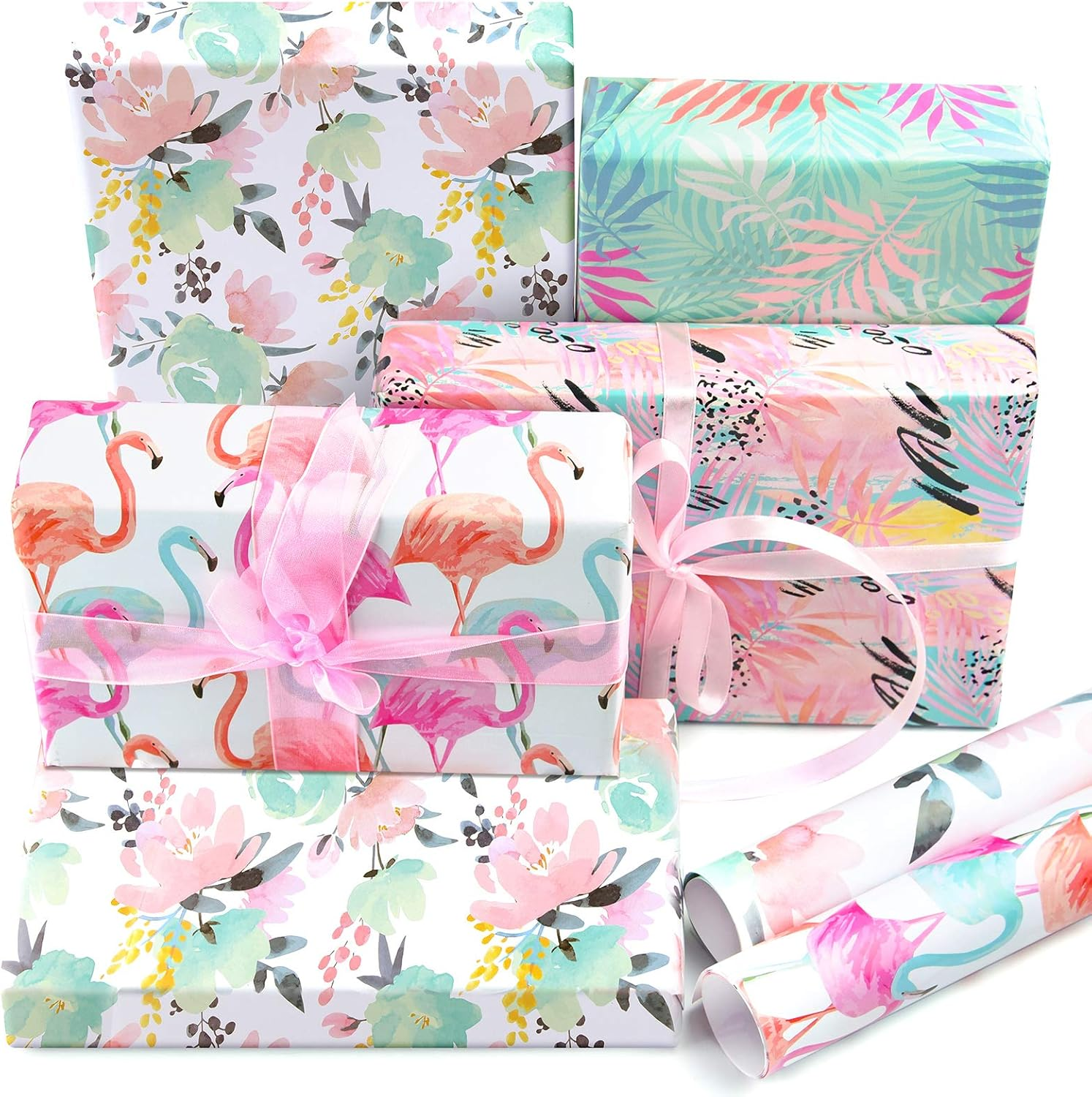 6 Sheets Tropical Birthday Gift Wrapping Paper, Flamingo Gift Wrap Paper for Bir