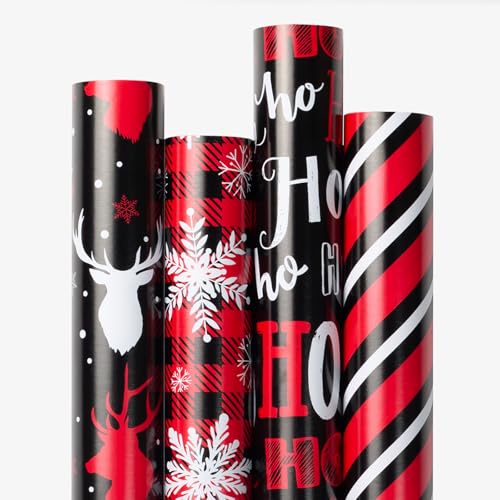 Yarcony Red and Black Chirstmas Wrapping Paper Jumbo Roll - 30 In X 120 In Per Roll - Festive Reindeer, Stripe, HO HO, Snowflake Design for Winter Gift Wrap Paper for Christmas, Holiday Collections