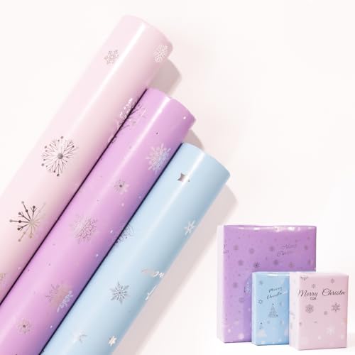 Christmas Wrapping Paper Roll,3 Rolls 43cm x 3m Xmas Gift Wrapping Paper,Metallic Gift Wrap Paper with Snowflake Xmas Tree Pattens for Christmas,Party,Festive Decorations (pink blue purple)