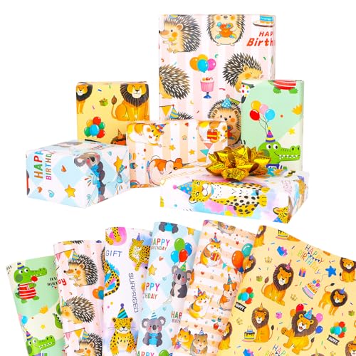 ZJHiome Birthday Wrapping Paper, 12 Sheets Animal Gift Wrap Paper for Kids, Boys & Girls Birthdays & Baby Showers, 50 x 70 cm
