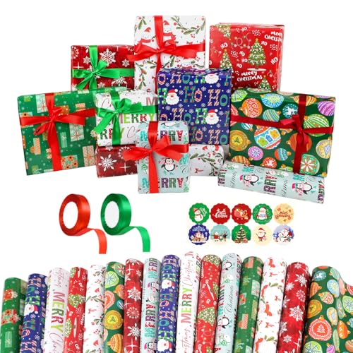 16 Sheets Christmas Gifts Wrapping Papers Set With Ribbon and Stickers, Thick Recyclable Xmas Gift Wrap Paper for Kids Children Adults Present Arts Crafts Decorations, Large Size 50X70 cm