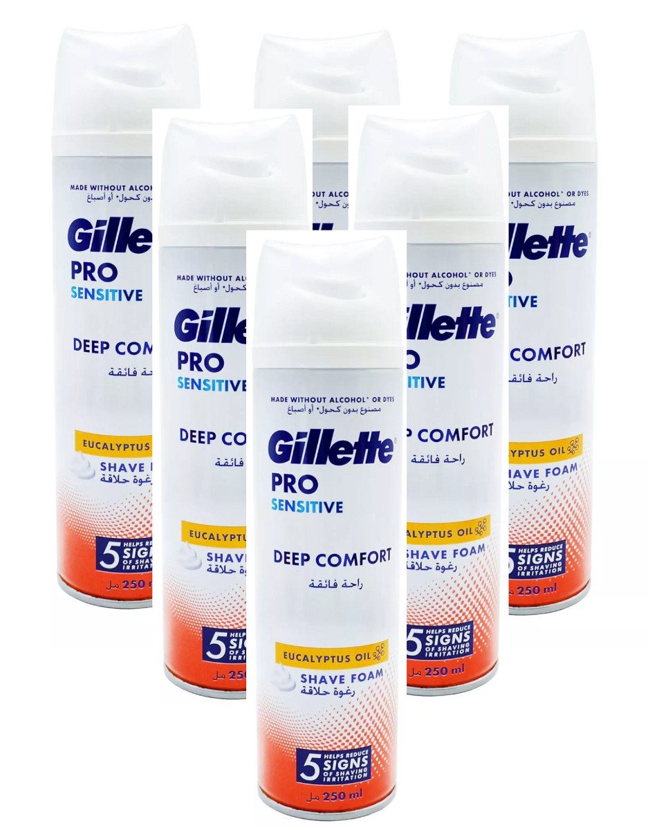 Gillette 6 x 250ml Pro Sensitive Deep Comfort Shave Foam with Eucalyptus Oil