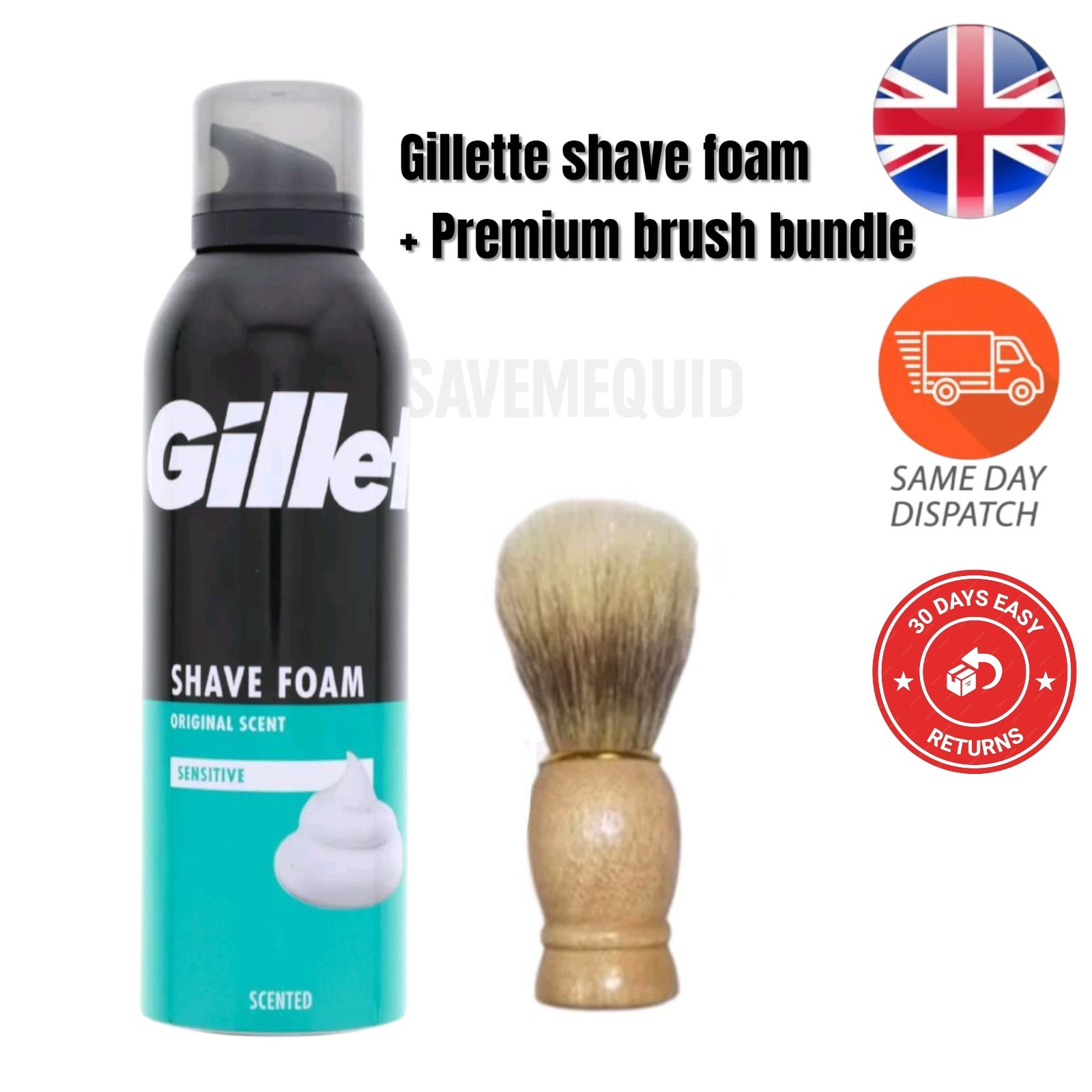Gillette Sensitive Shave Foam 200ml + Premium Wooden Brush Gift Bundle Free P&P