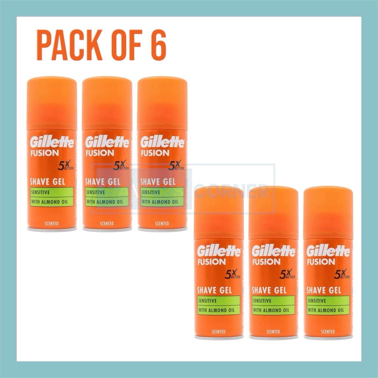 6x Gillette Fusion Sensitive Shave Gel 75ml Scented with Almond Oil Free P&P