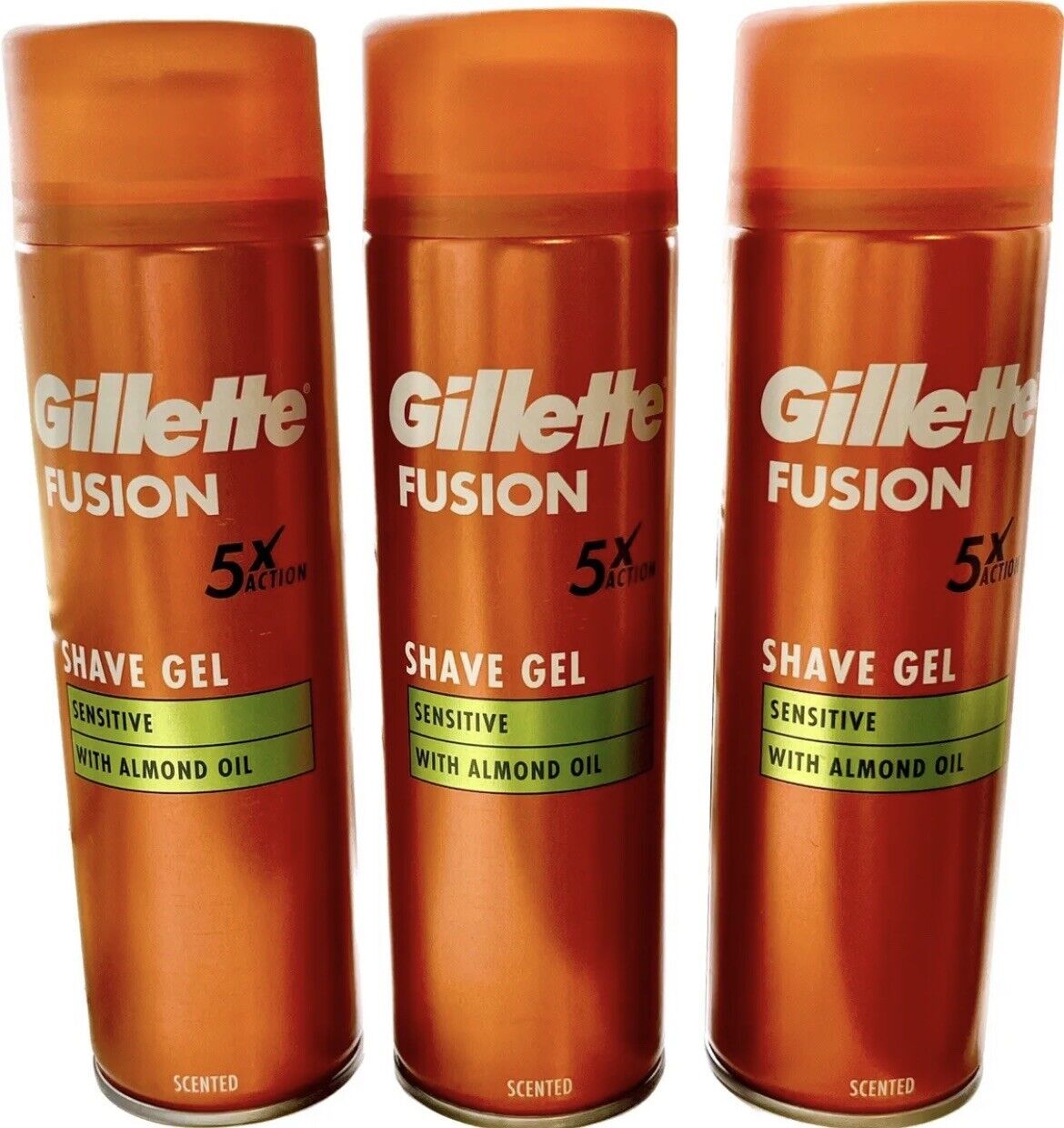 3x Gillette Fusion 5X Action Sensitive Men's Shaving Gel With Almond Oil 200ml