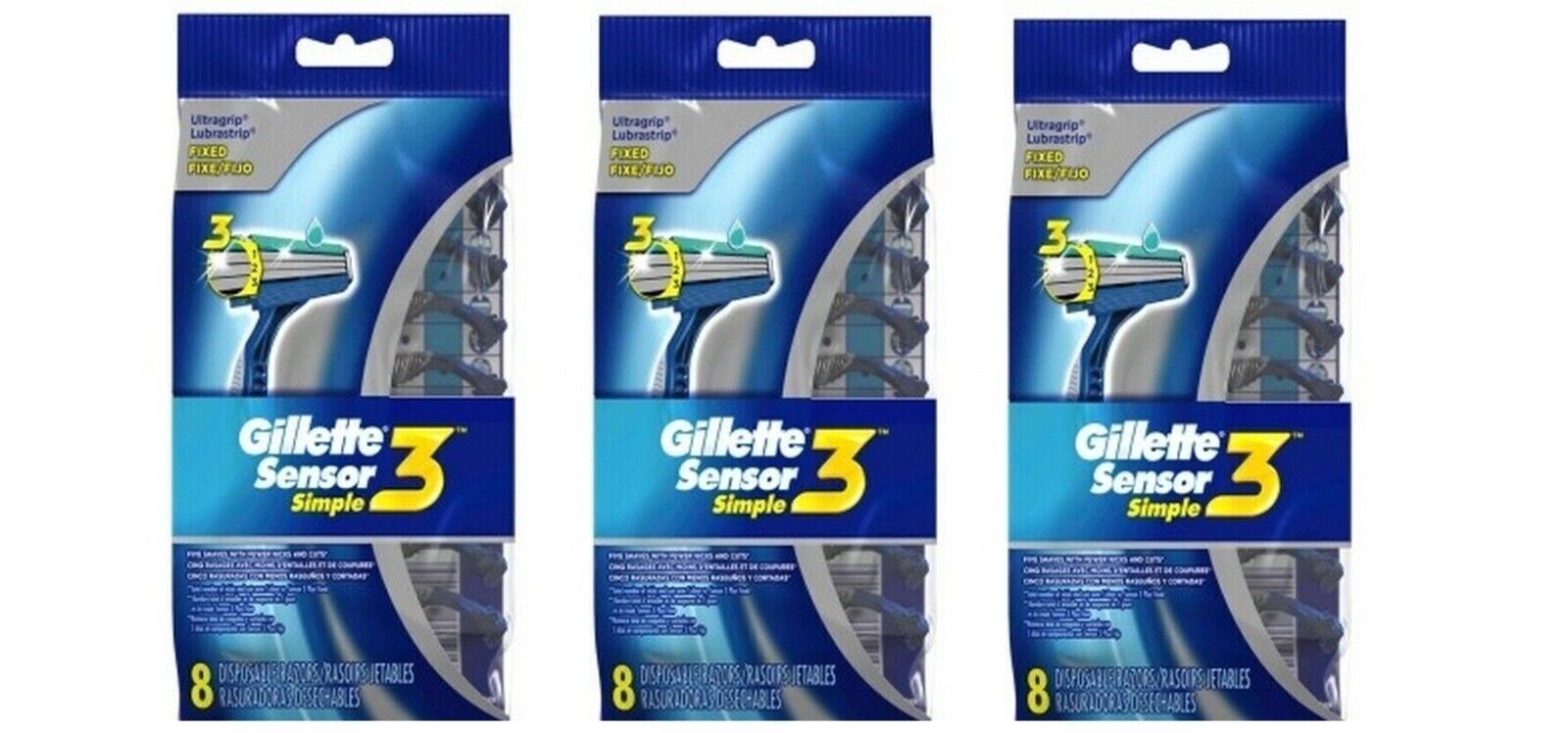 BL Gillette Mens Sensor 3 Simple Disposable Razor 8 Count - THREE PACK