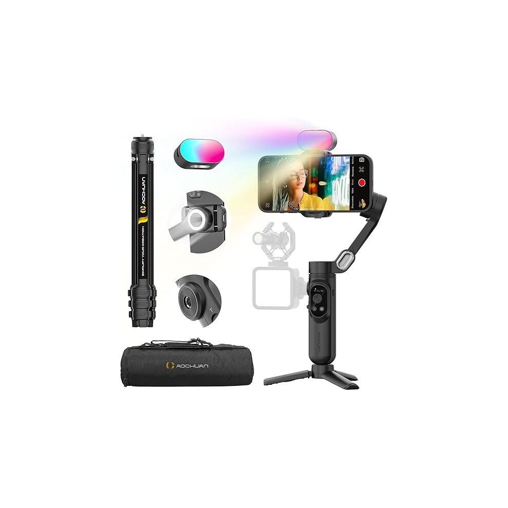 AOCHUAN 3-Axis Gimbal Stabilizer for Smartphone, Gimbal w/RGB Magnetic Fill Light Upgraded Face Tracking Focus Wheel Foldable iPhone Gimbal for iPhone
