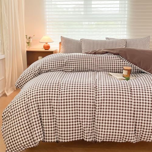 NSNLGSGC Mocha Gingham Duvet Cover Set Queen, Dark Tan Grid Simple Geometric Square Pattern Comforter Cover,Soft Plaid Washed Microfiber Bedding Cover(3PCS,Queen)