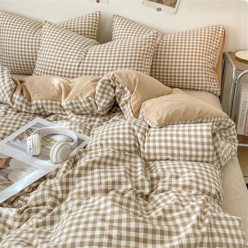 Michorinee Beige Gingham Grid Duvet Cover Double Reversible Tan Plaid Checkered Pattern Washed Microfiber Quilt Cover Double Bed Bedding Set with Zipper Closure and Pillow Cases 50x75 cm