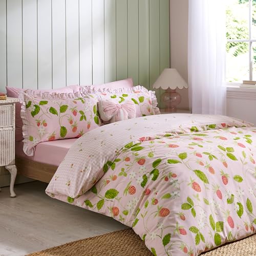 Catherine Lansfield Strawberry Frills Gingham Reversible Single Duvet Cover Set with Pillowcase Pink
