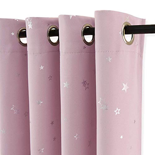 PONY DANCE Eyelet Girls Curtains - Kids Star Foil Printed Blackout Thermal Pink Curtains for Nursery Bedroom, 52 inch Wide by 90 inch Long, Light Pink, 2 Panels