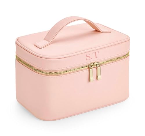Personalised Vanity Case, Custom Initials, Large Cosmetic Case, Gift for Girls, Ladies Make Up Bag, Travel Accessories, Leather Toiletry Bags (Soft-Pink)