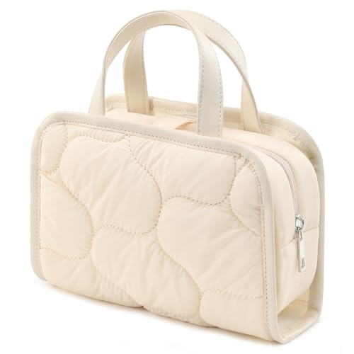 Travel Makeup Bag, Large Capacity Cosmetic Bag for Women Girls, Wide Open Make up Bag Pouch with Compartments Handles Zippers, Portable Travel Cosmetic Toiletry Wash Storage Organiser Bag (White)