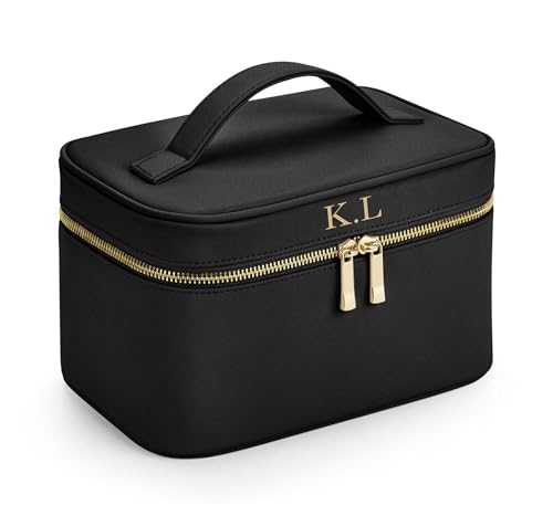Personalised Vanity Case, Custom Initials, Large Cosmetic Case, Gift for Girls, Ladies Make Up Bag, Travel Accessories, Leather Toiletry Bags (Black)