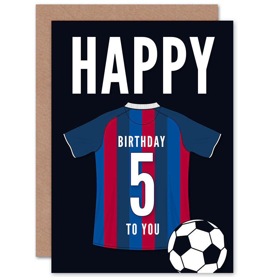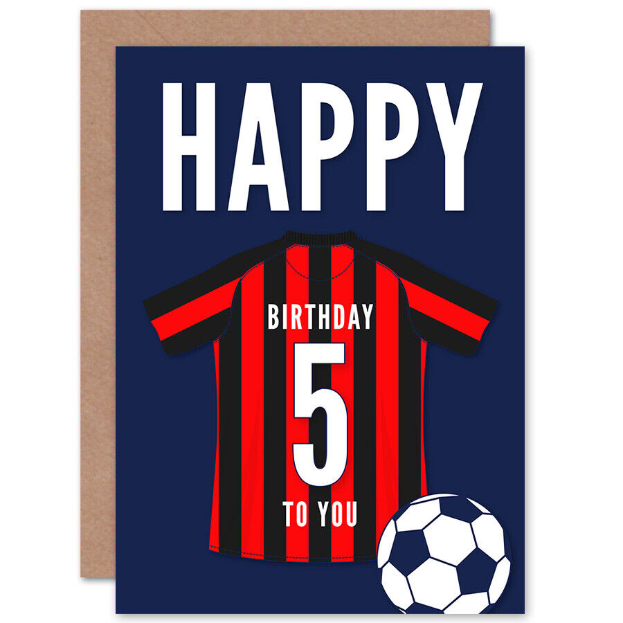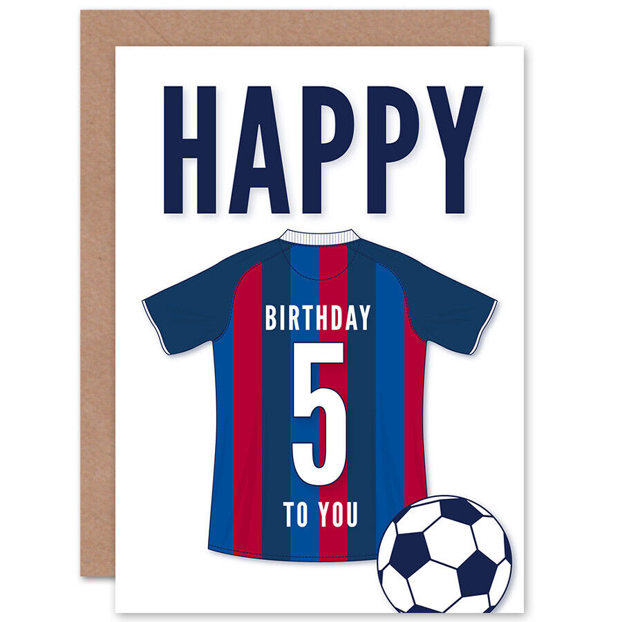 Soccer Football 5th Birthday Card for Boys Girls Blue Red Striped Top on White