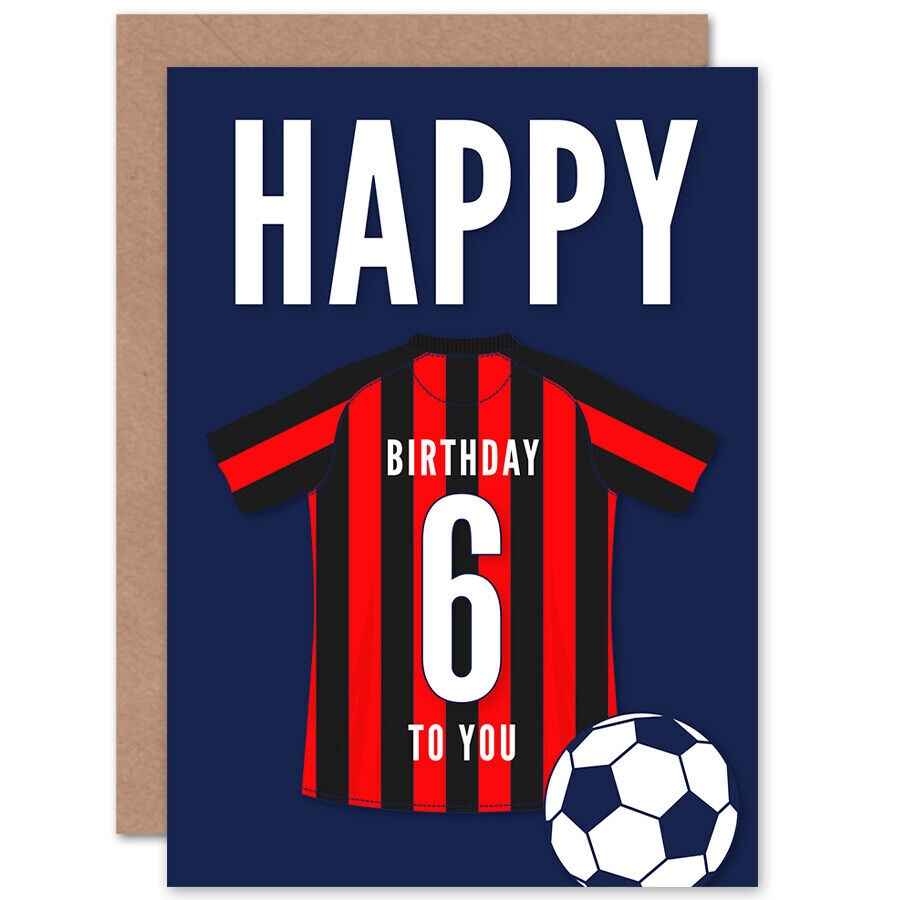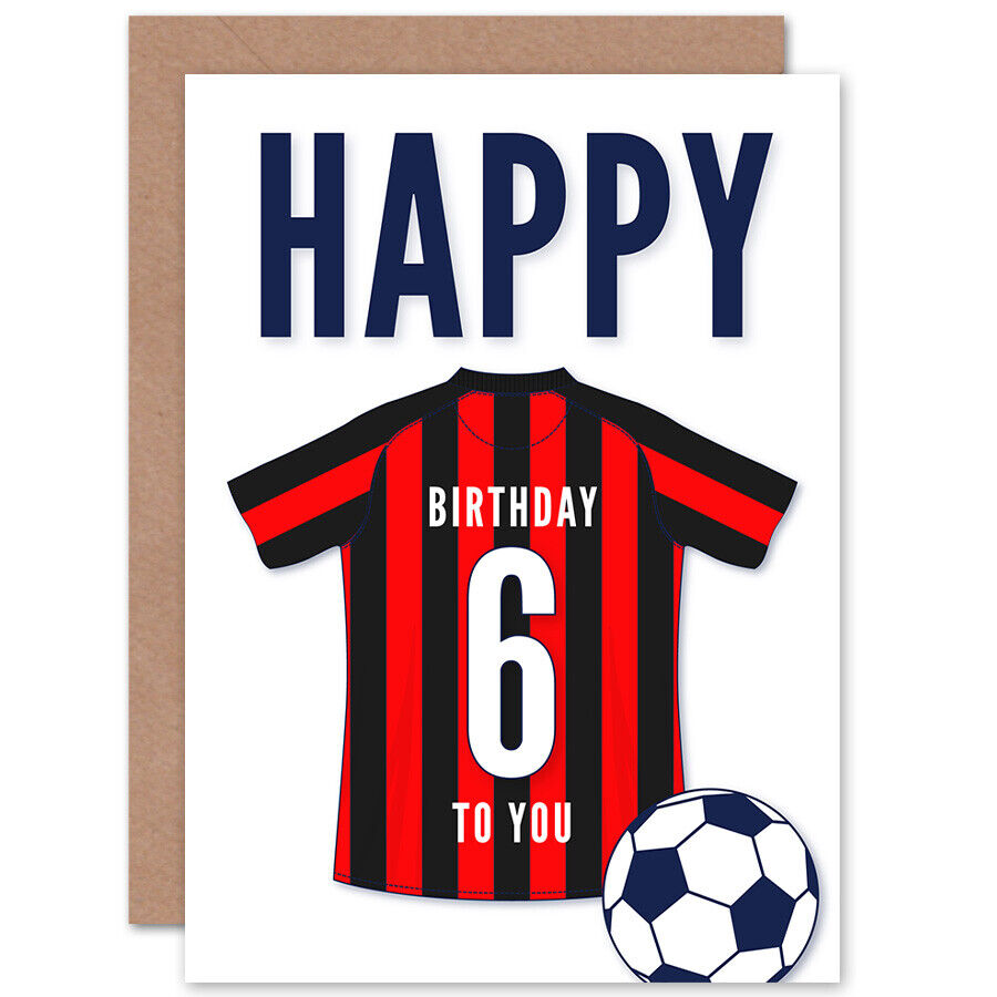 Soccer Football 6th Birthday Card for Boys Girls Black Red Striped Top on White
