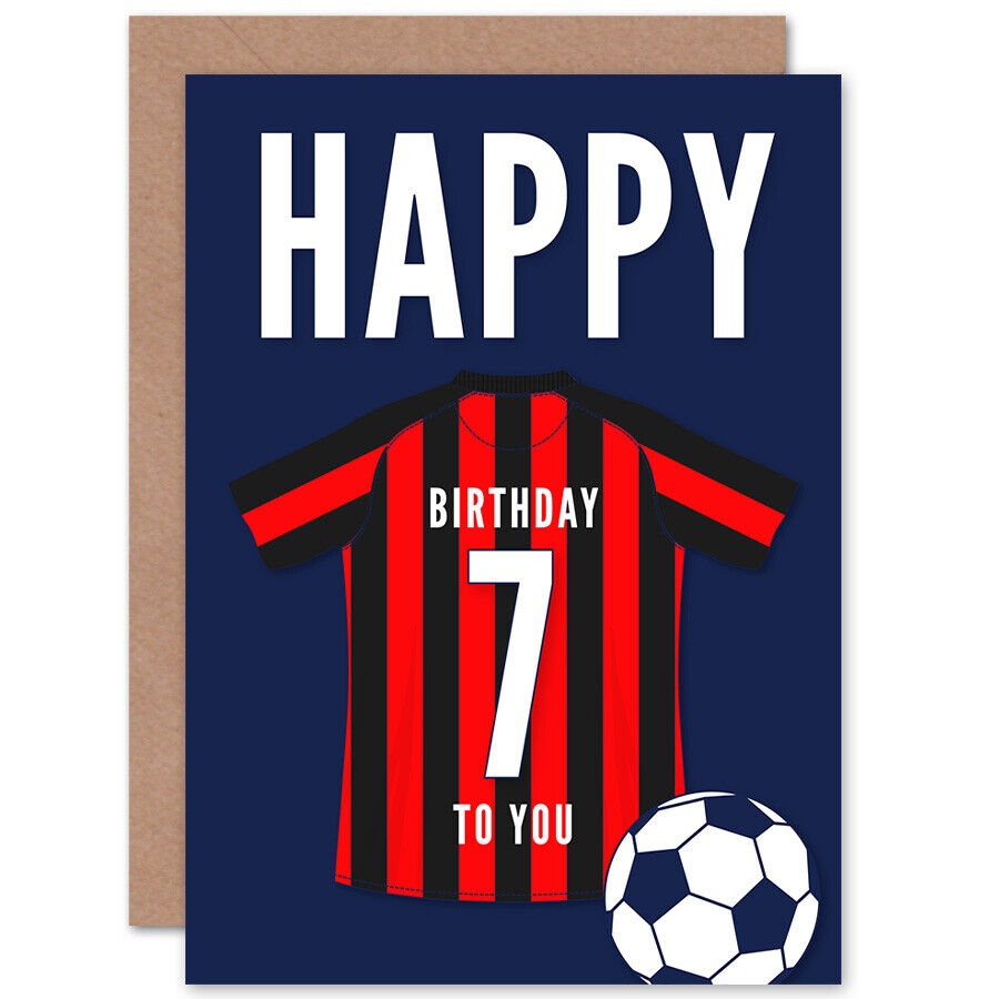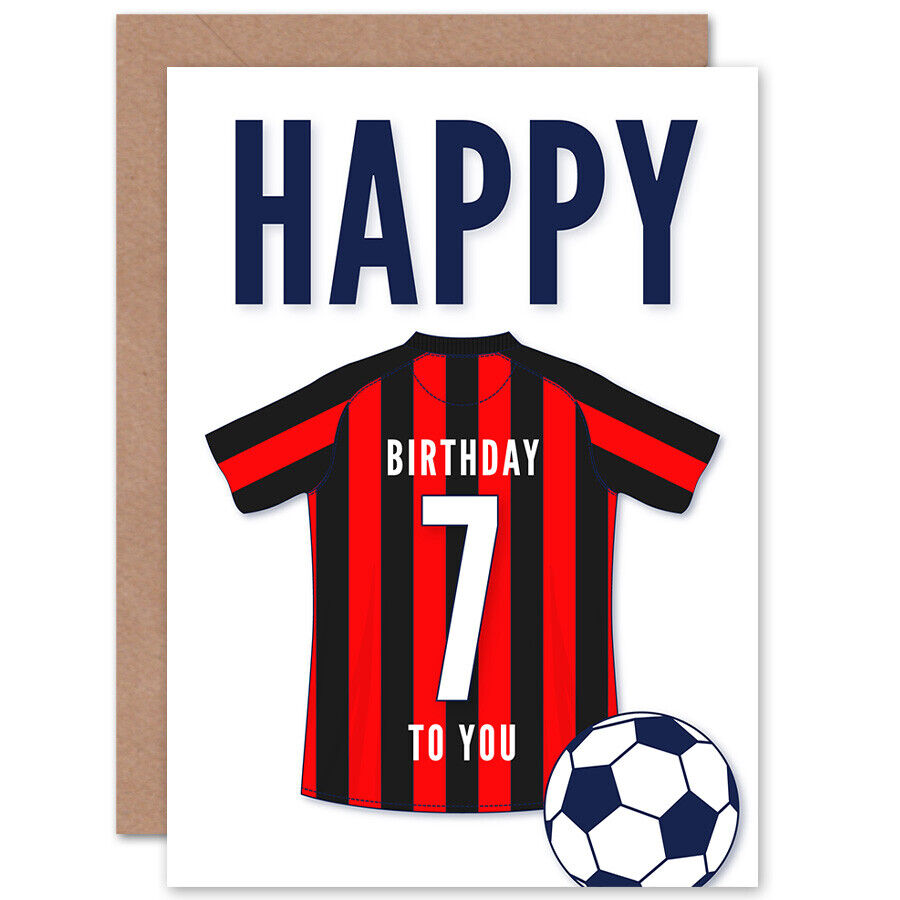 Soccer Football 7th Birthday Card for Boys Girls Black Red Striped Top on White