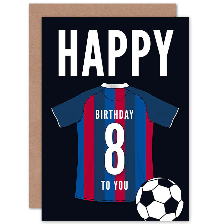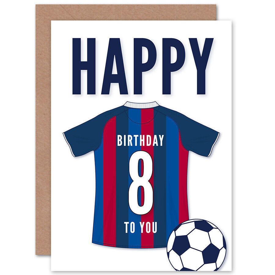 Soccer Football 8th Birthday Card for Boys Girls Blue Red Striped Top on White