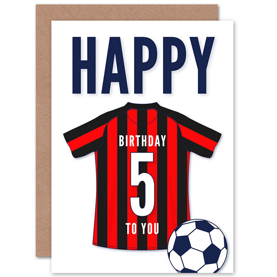Soccer Football 5th Birthday Card for Boys Girls Black Red Striped Top on White