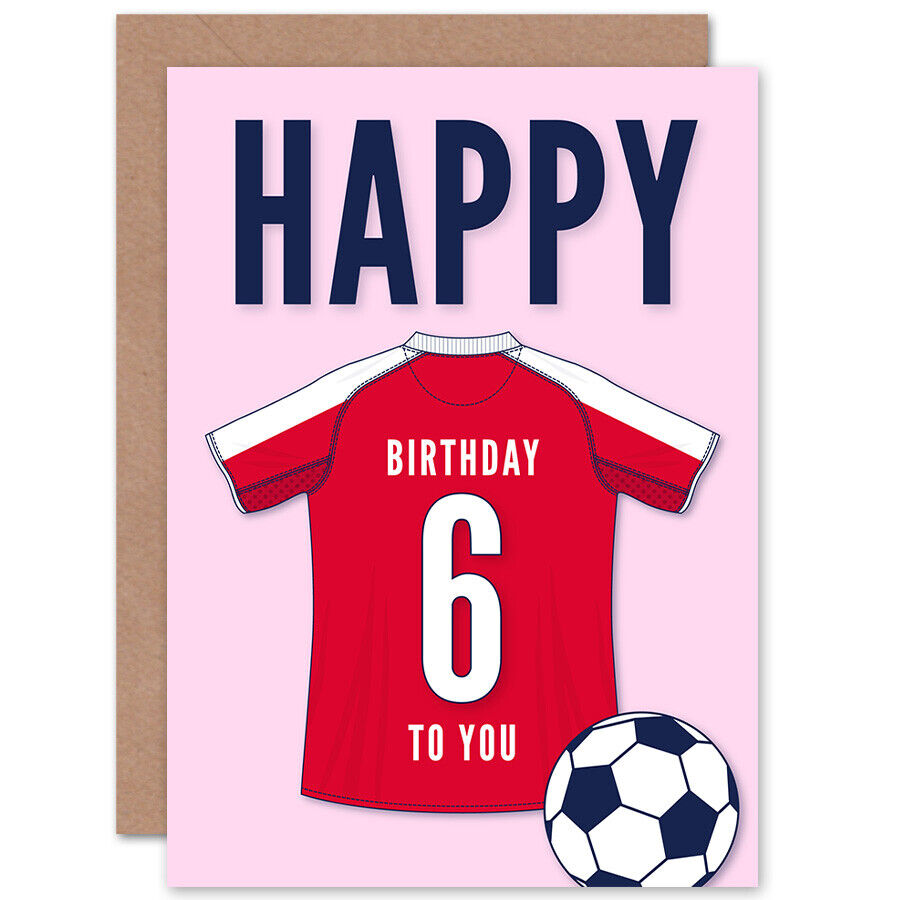 Football Fan 6th Happy Birthday Card for Boys Girls Red Jersey Football Top on Pink Background