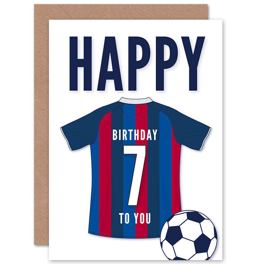 Soccer Football 7th Birthday Card for Boys Girls Blue Red Striped Top on White