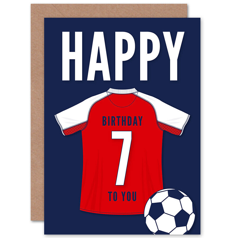 Football Fan 7th Happy Birthday Card for Boys Girls Red Jersey Football Top on White Background