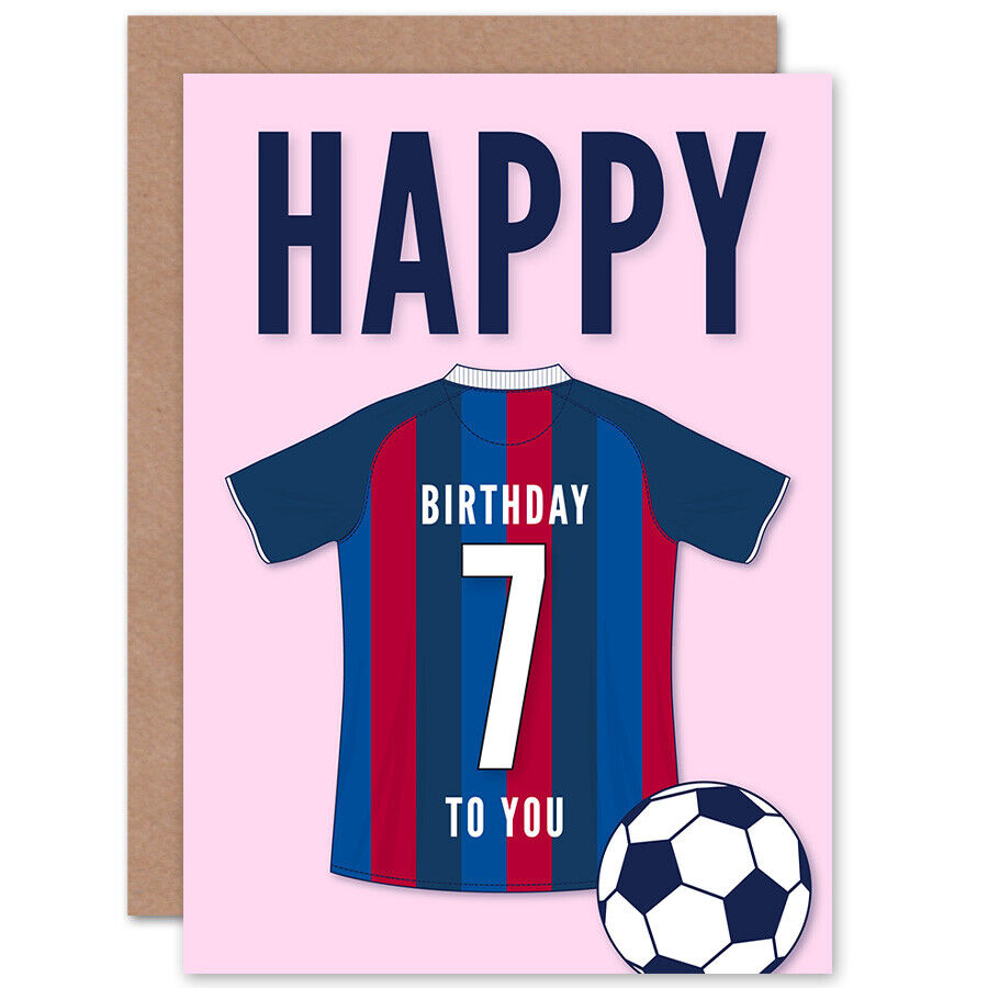 Soccer Football 7th Birthday Card for Boys Girls Blue Red Striped Top on Pink