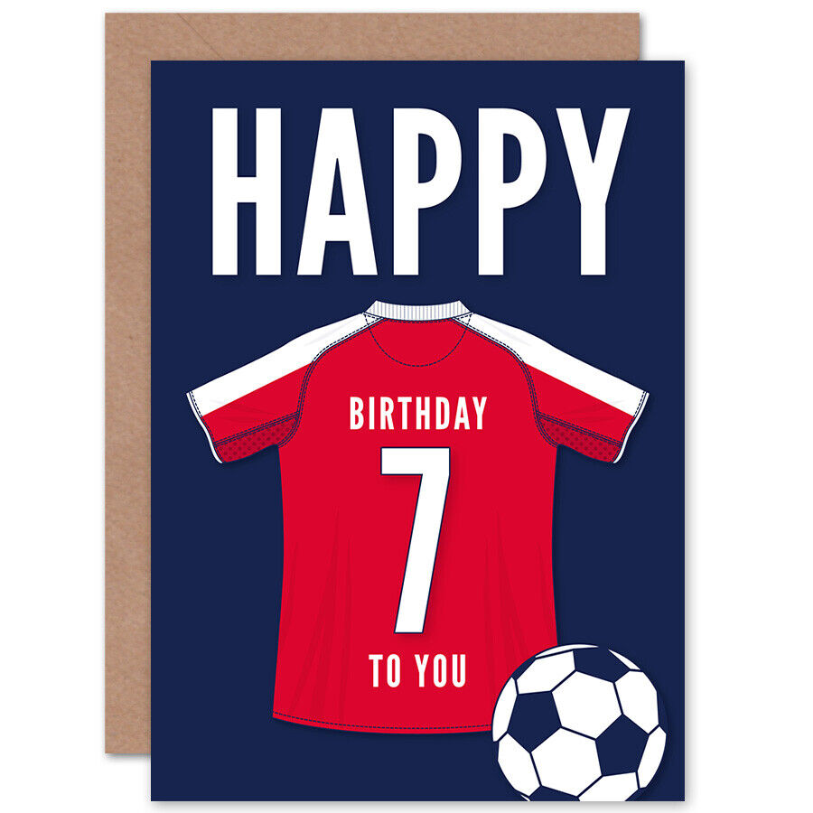 Football Fan 7th Happy Birthday Card for Boys Girls Red Jersey Football Top on Dark Blue Background
