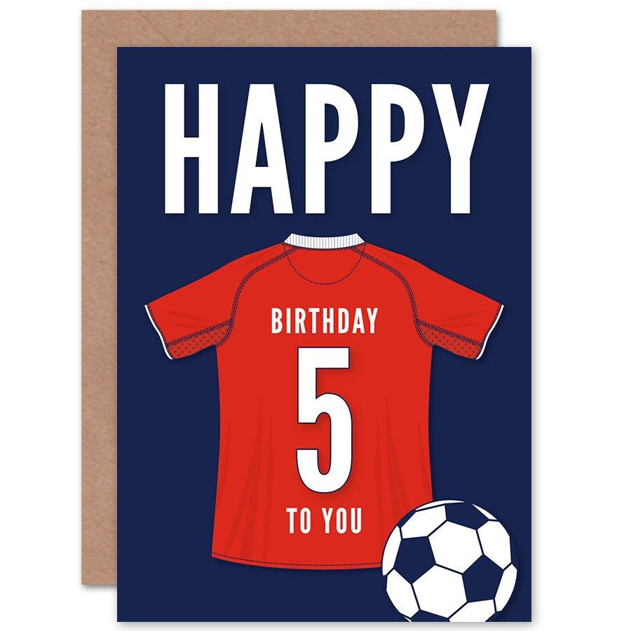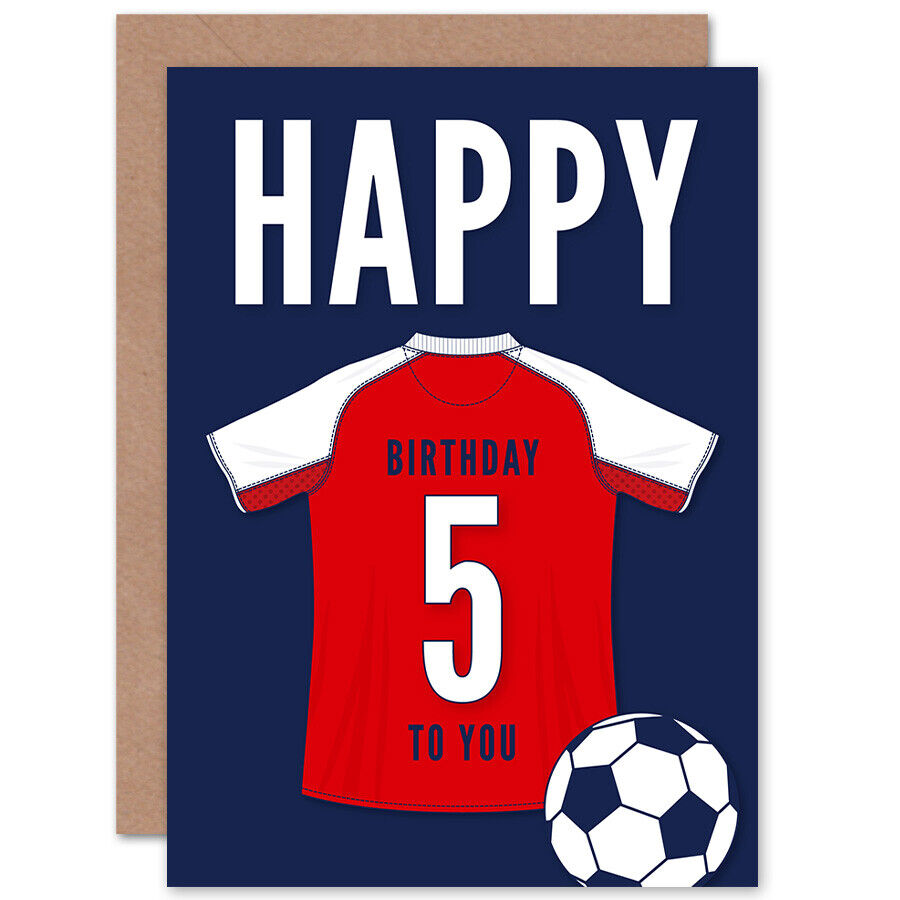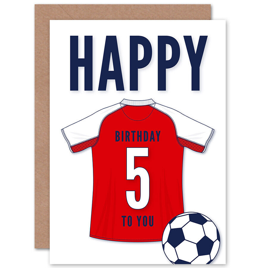 Football Fan 5th Happy Birthday Card for Boys Girls Red Jersey Football Top on White Background