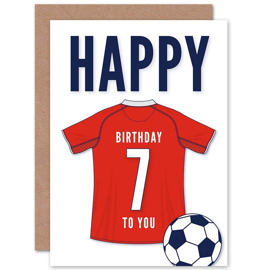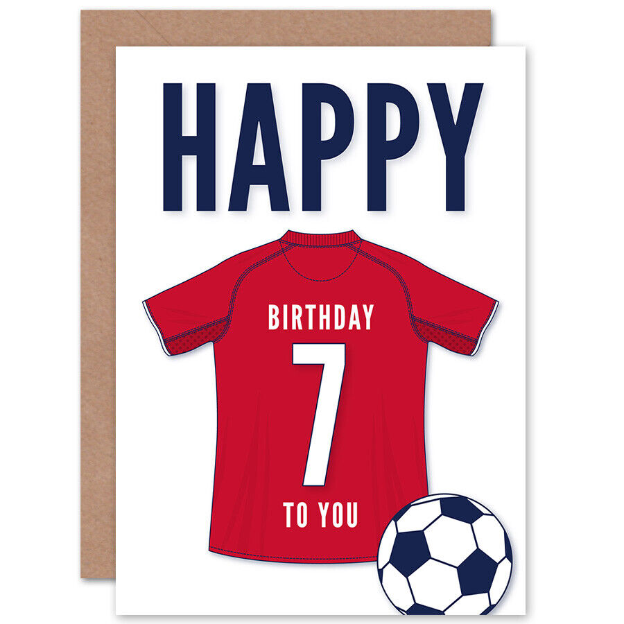 Soccer Football 7th Birthday Card for Boys Girls Red Jersey Top on White