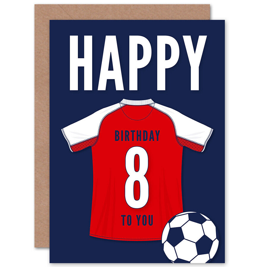 Football Fan 8th Happy Birthday Card for Boys Girls Red Jersey Football Top on Dark Blue Background