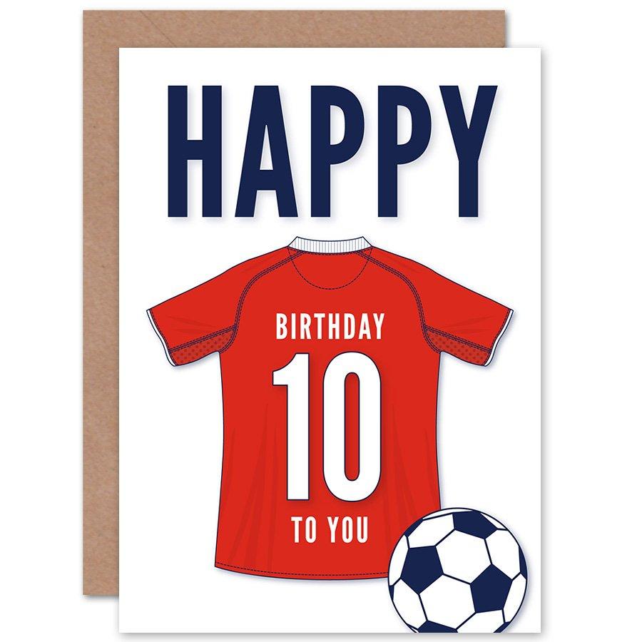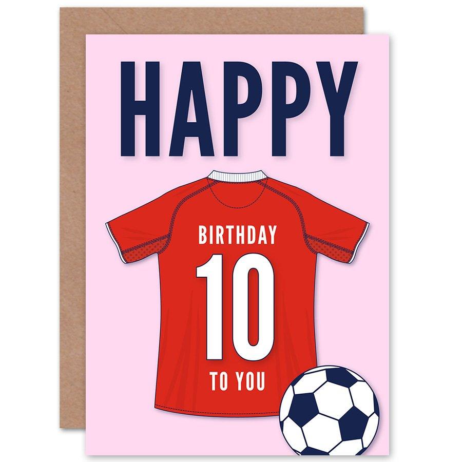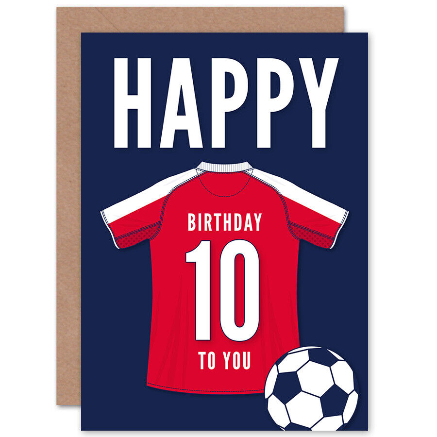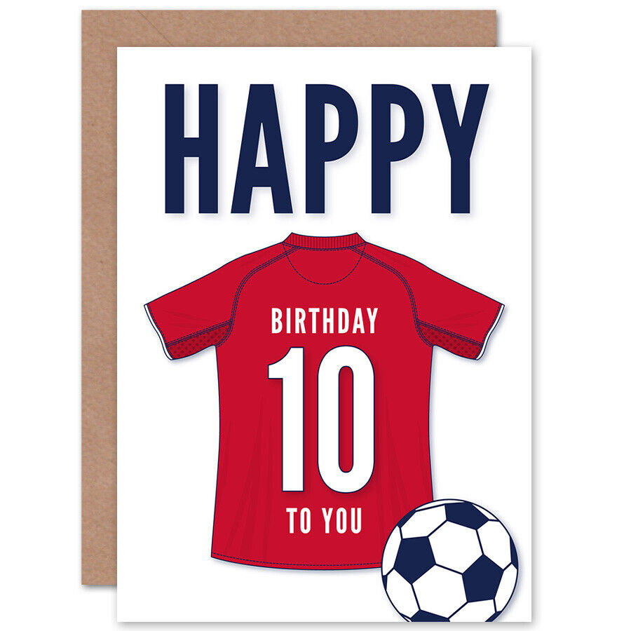 Football Fan 10th Happy Birthday Card for Boys Girls Red Jersey Football Top on White Background