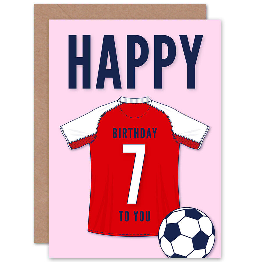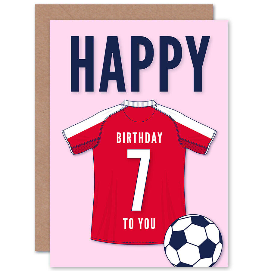 Soccer Football 7th Birthday Card for Boys Girls White Red Jersey Top on Pink