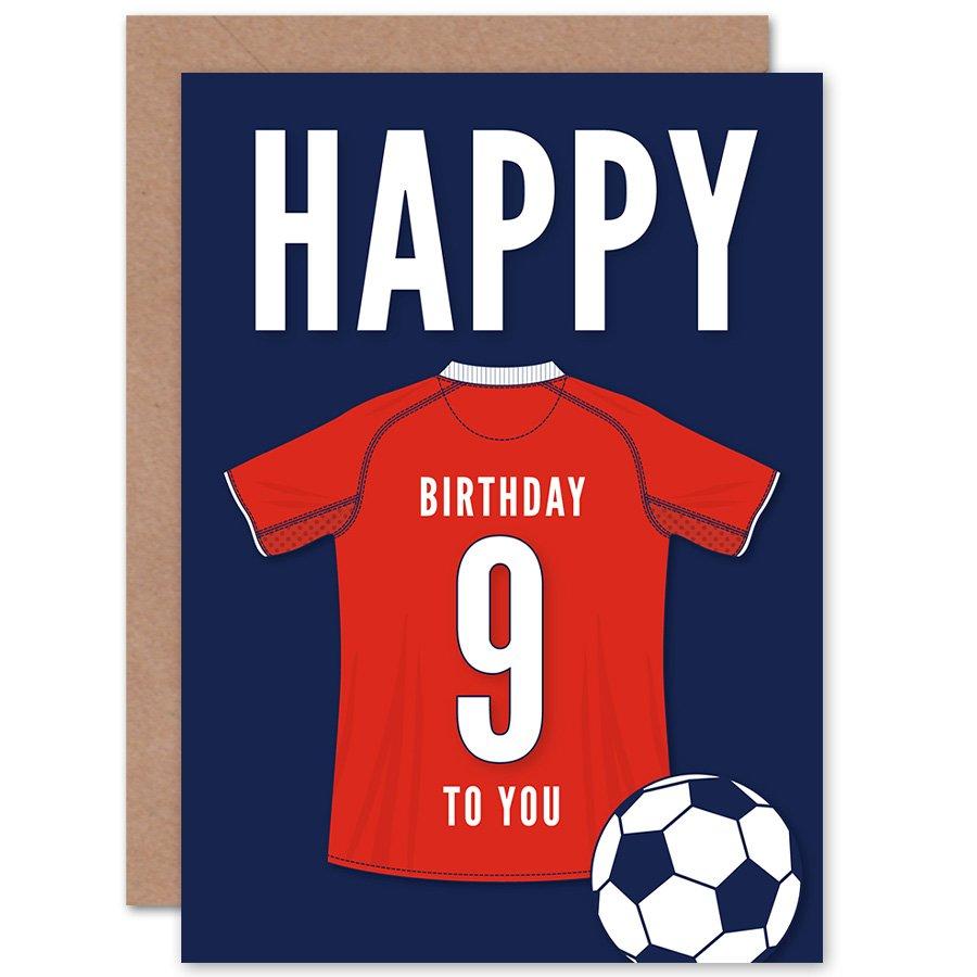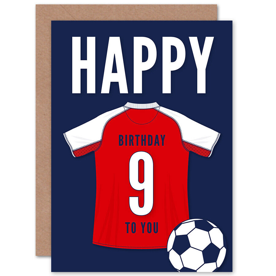 Football Fan 9th Happy Birthday Card for Boys Girls Red Jersey Football Top on White Background