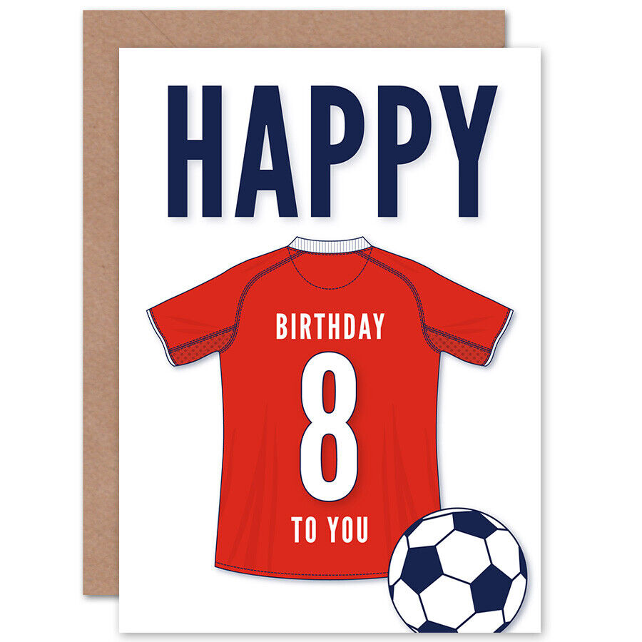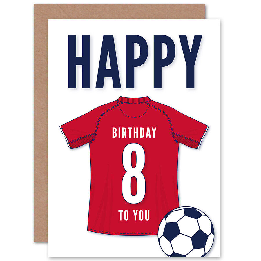 Soccer Football 8th Birthday Card for Boys Girls Red Jersey Top on White
