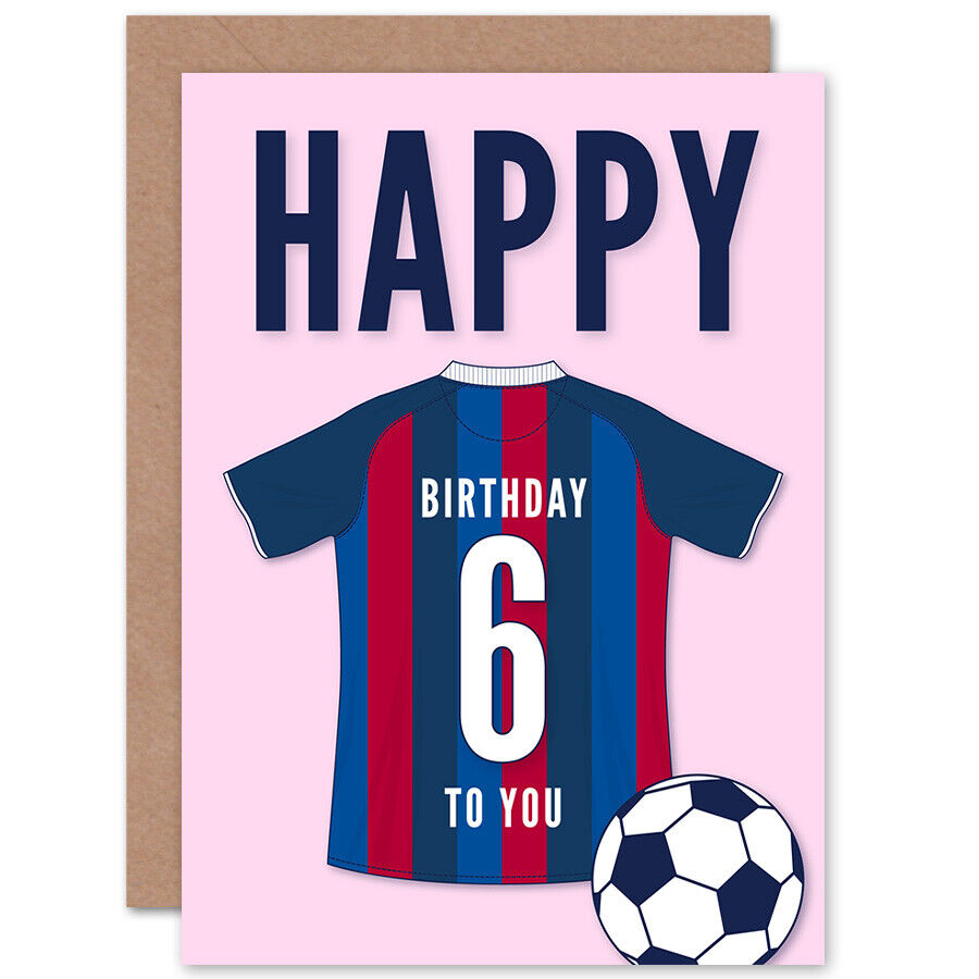 Soccer Football 6th Birthday Card for Boys Girls Blue Red Striped Top on Pink