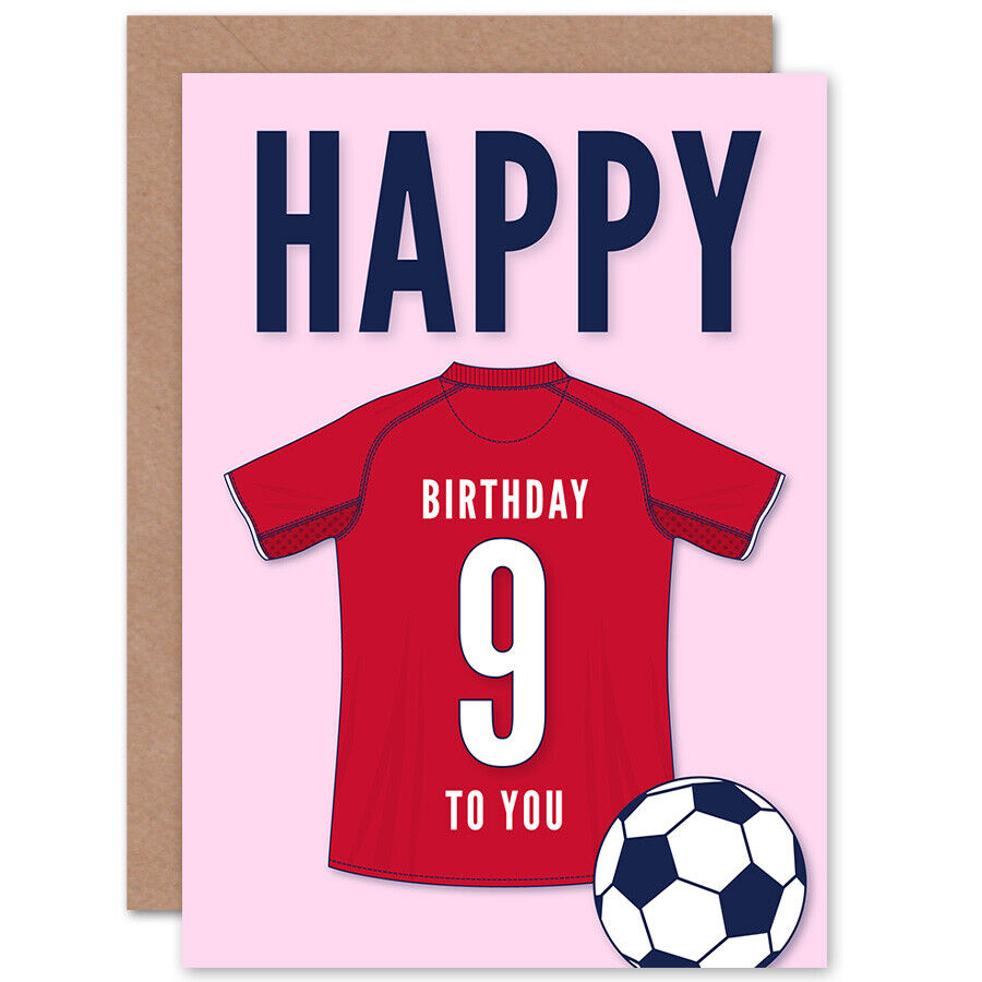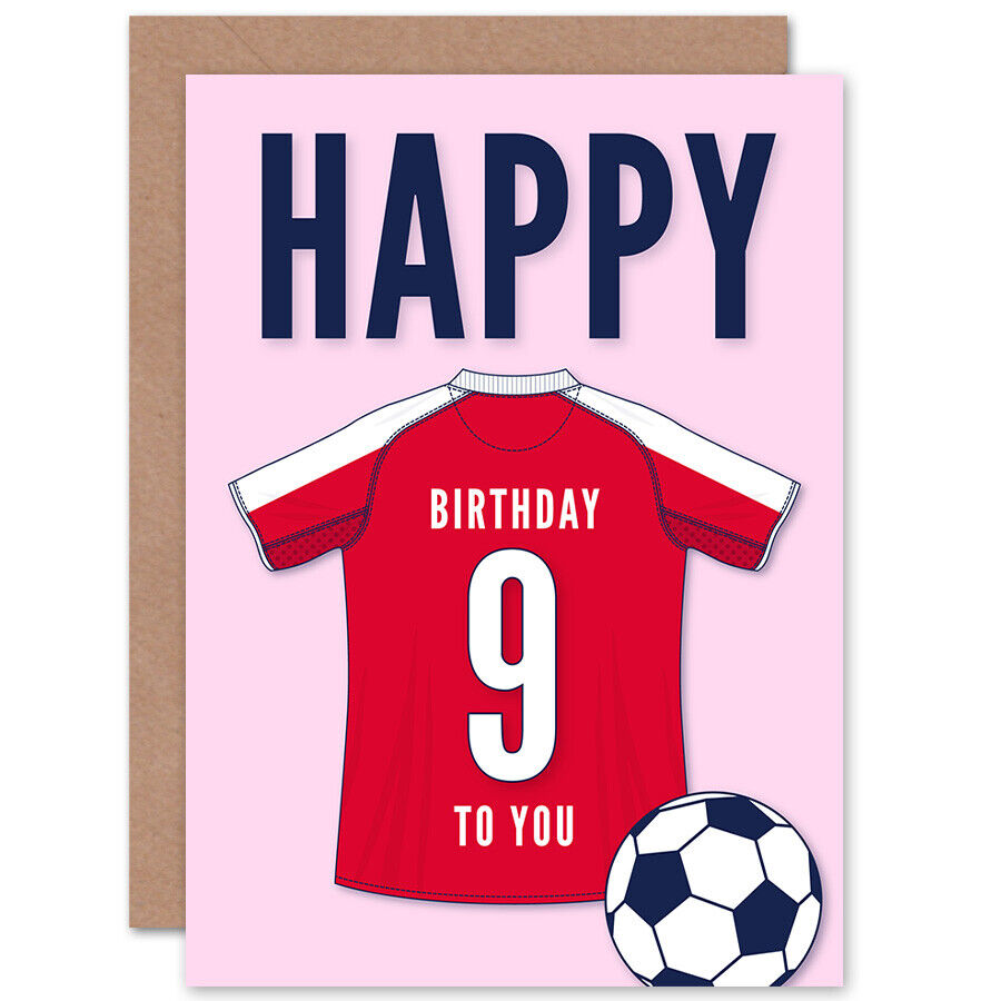 Soccer Football 9th Birthday Card for Boys Girls White Red Jersey Top on Pink