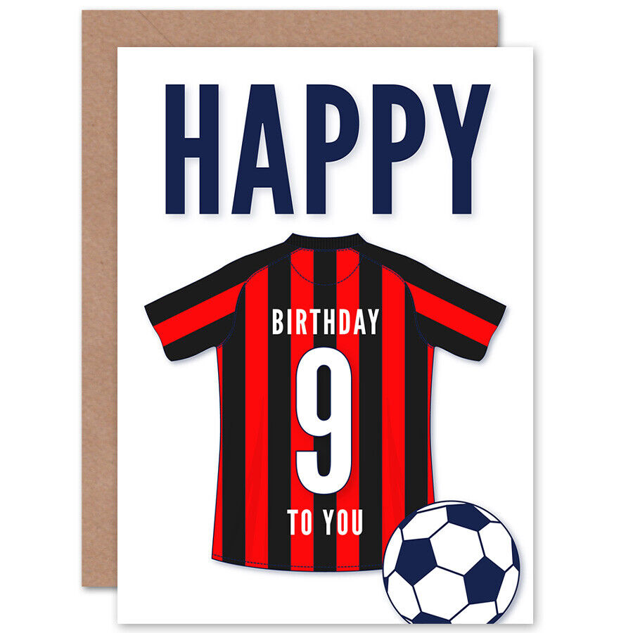 Soccer Football 9th Birthday Card for Boys Girls Black Red Striped Top on White