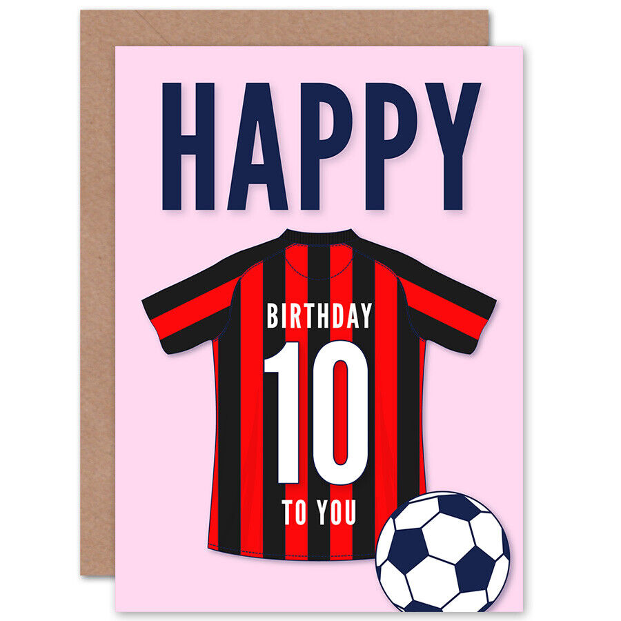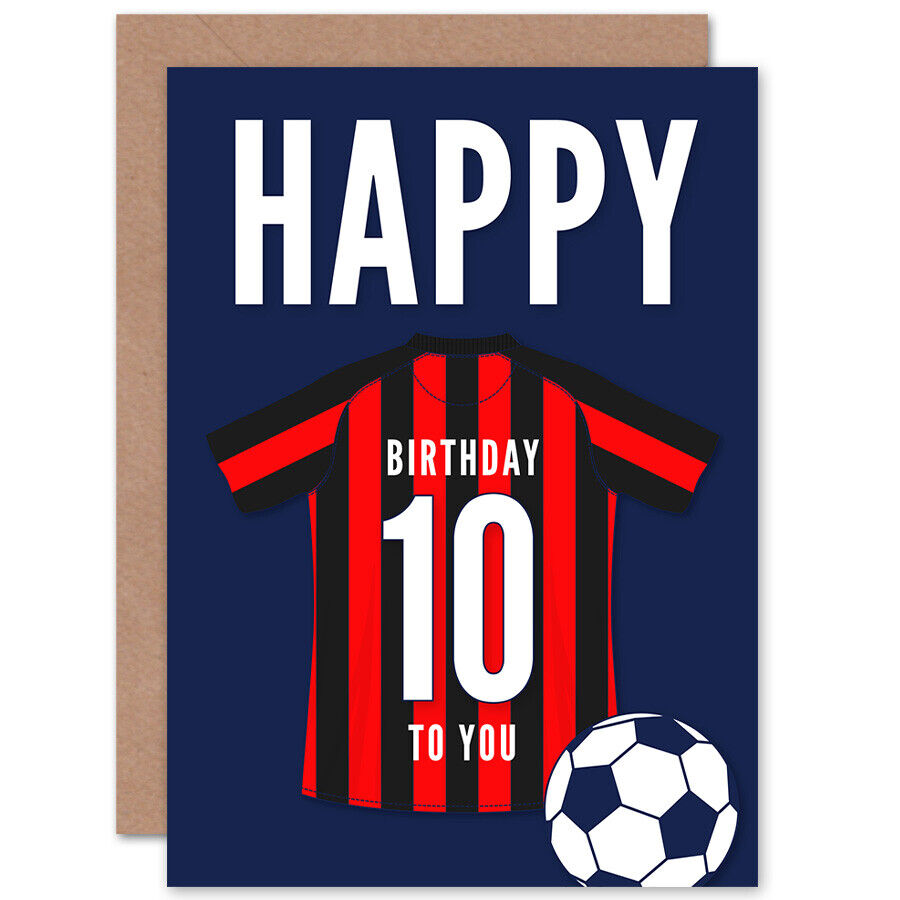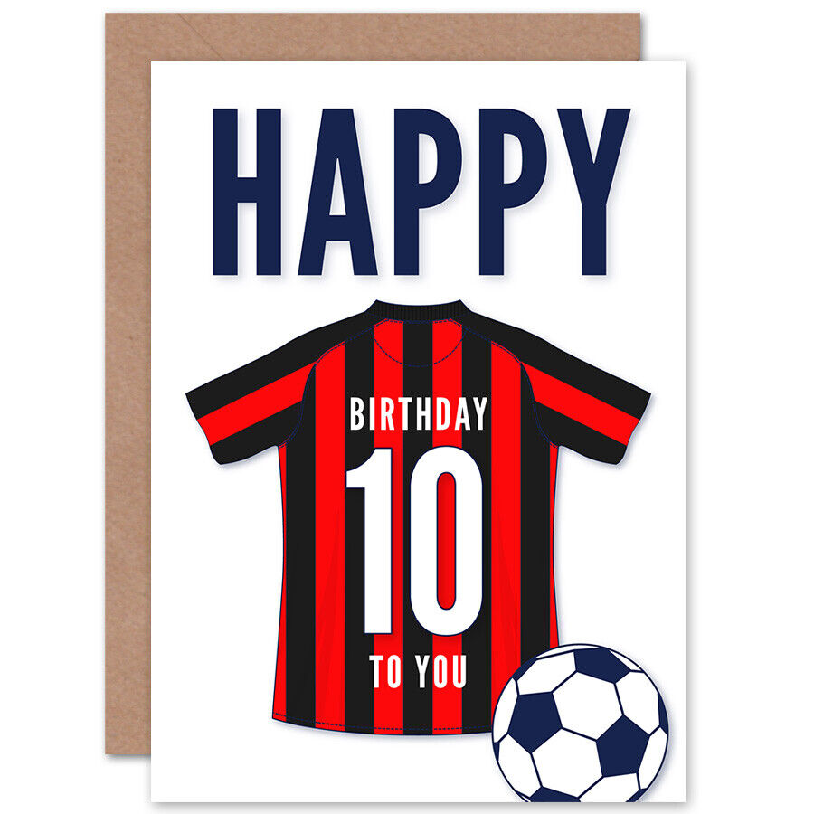 Soccer Football 10th Birthday Card for Boys Girls Black Red Striped Top on White