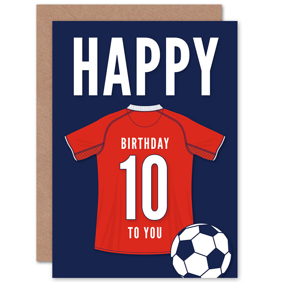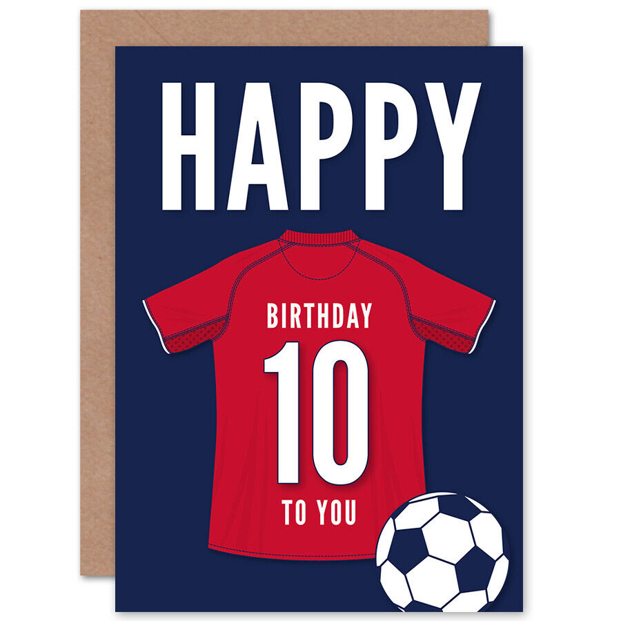 Soccer Football 10th Birthday Card for Boys Girls White Red Top on Dark Blue