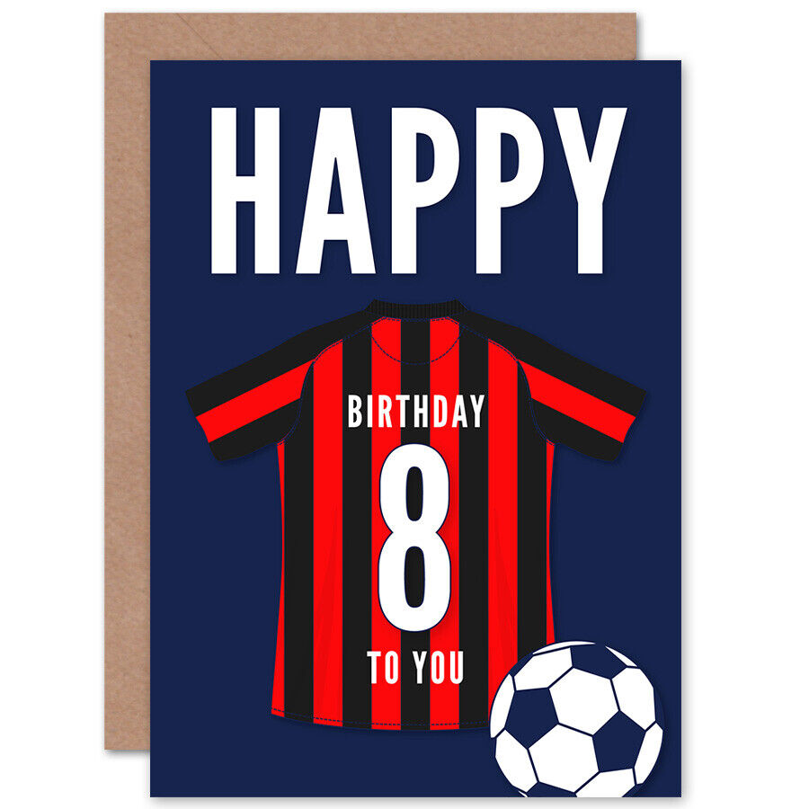 Soccer Football 8th Birthday Card for Boys Girls Black Red Striped Top on White