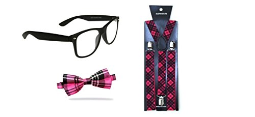 Ladies Mens Girls Nerd geek PINK TARTAN fancy dress costume glasses tie and braces 80's dweeb school