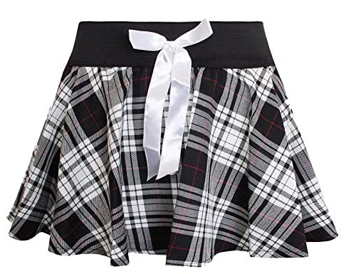 Ladies Sexy School Girls Elastic Waistband Tartan Skirt with Bow Party Fancy Dress (White/Black, L/XL)
