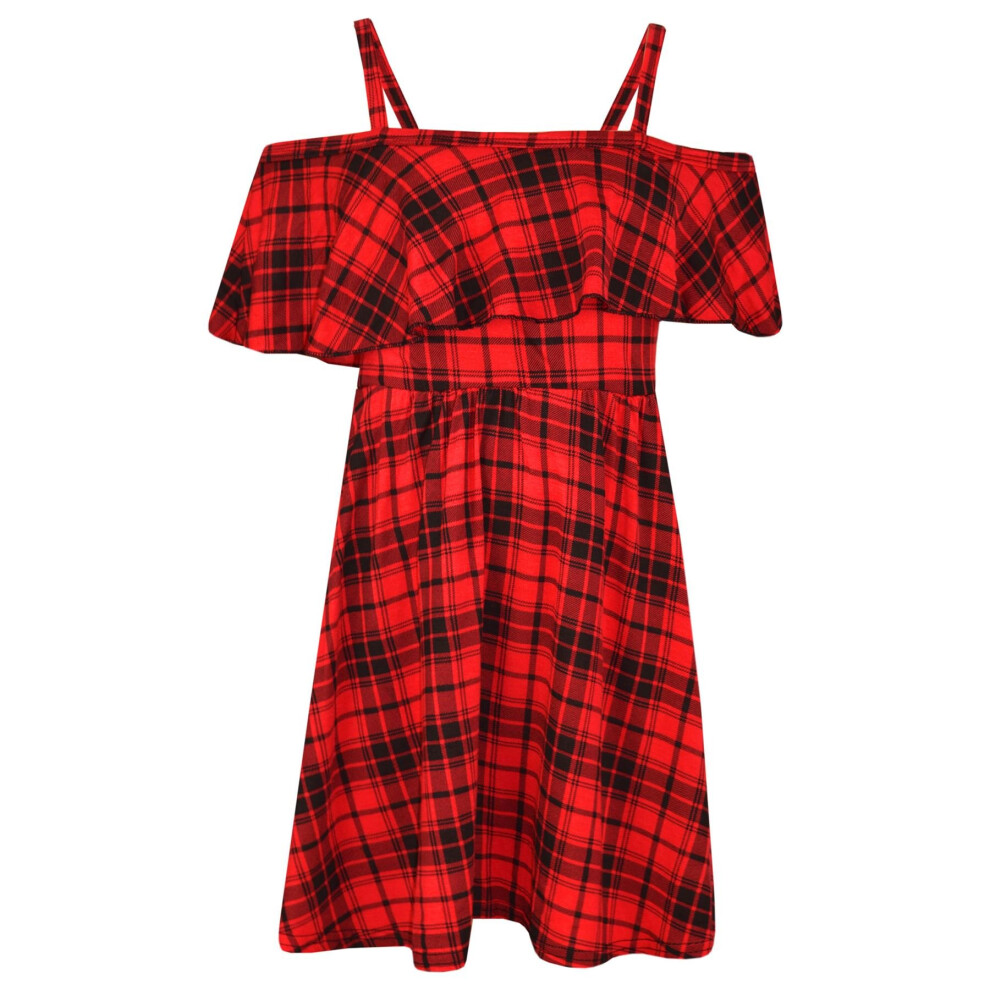 (13 Years) Girls Skater Dress Kids Red Tartan Summer Party Off Shoulder Dresses 7-13 Years