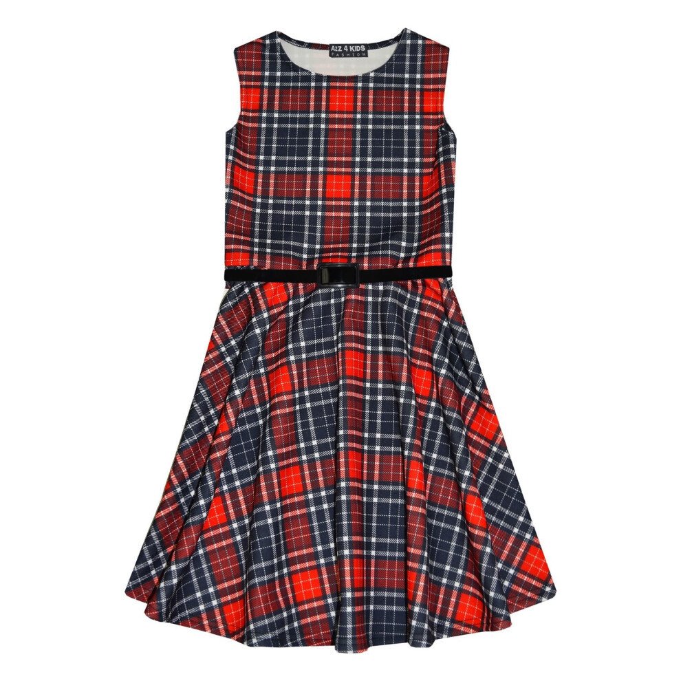 (13 Years) Girls Skater Dress Kids Red & Black Tartan Print Summer Party Dresses 7-13 Years
