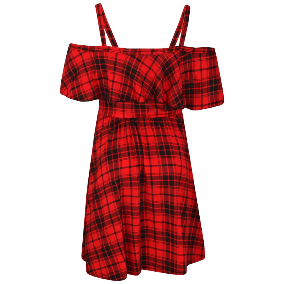 (11-12 Years) Girls Skater Dress Kids Red Tartan Summer Party Off Shoulder Dresses 7-13 Years