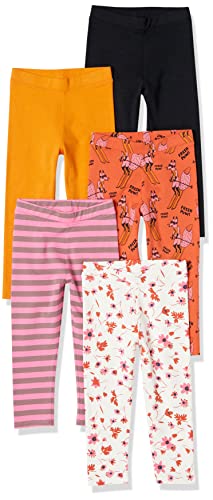 Amazon Essentials Girls' Leggings, Pack of 5, Black Stars/Grey/Orange/Peach Leaf Print/White Stripes, 5 Years