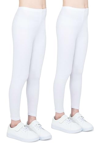 looksy 2-Pack Girls Cotton Leggings Kids Trousers PE Dance Sports Soft Stretchy Long Pants for School Everyday Wear and Activities, White 9 Years (134 cm)