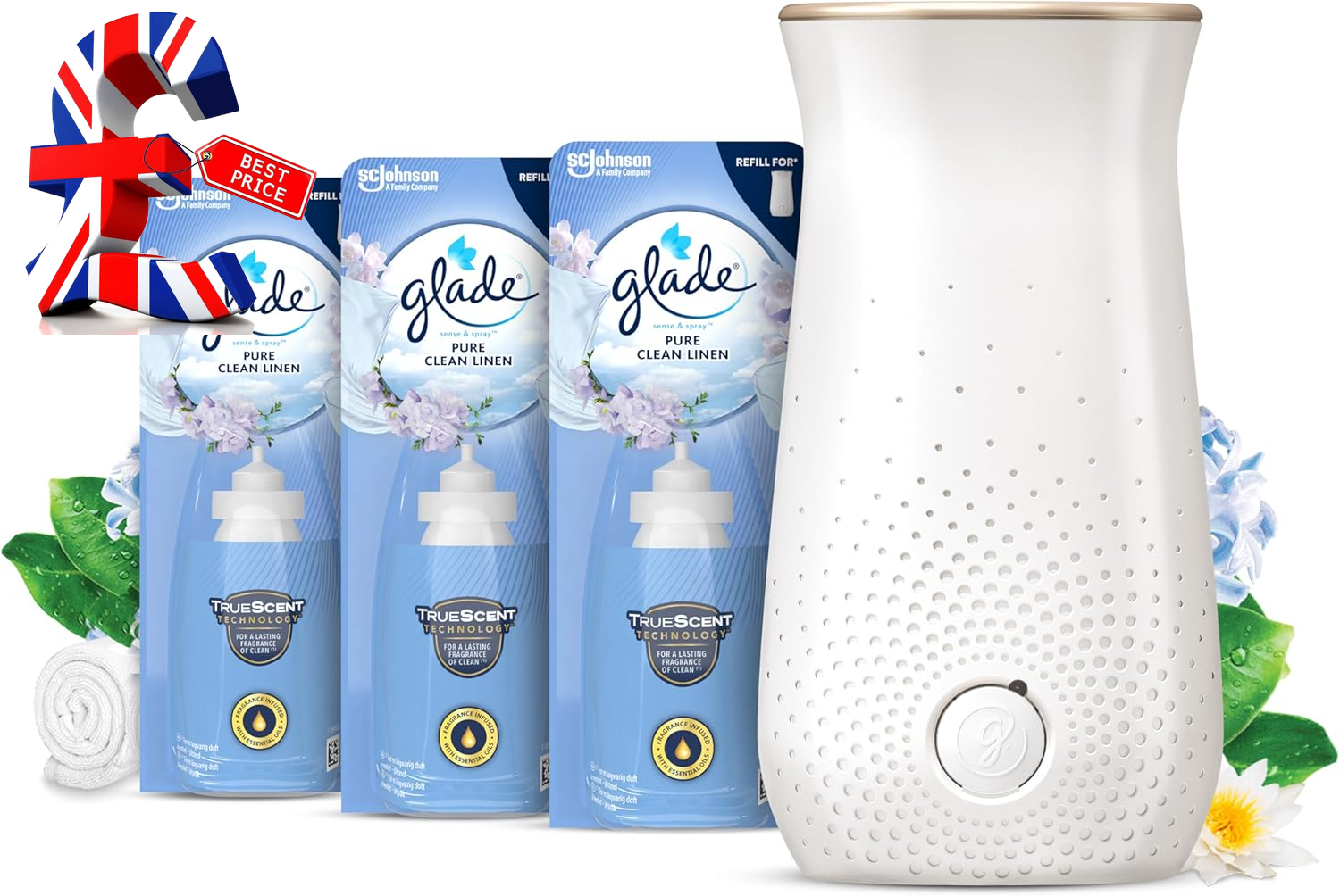 Glade Sense & Spray Air Freshener Holder and Refills, Motion Activated Automatic Room Spray and Odour Eliminator for Home, Clean Linen, 1 Holder and 3 Refills (3 x 18ml)