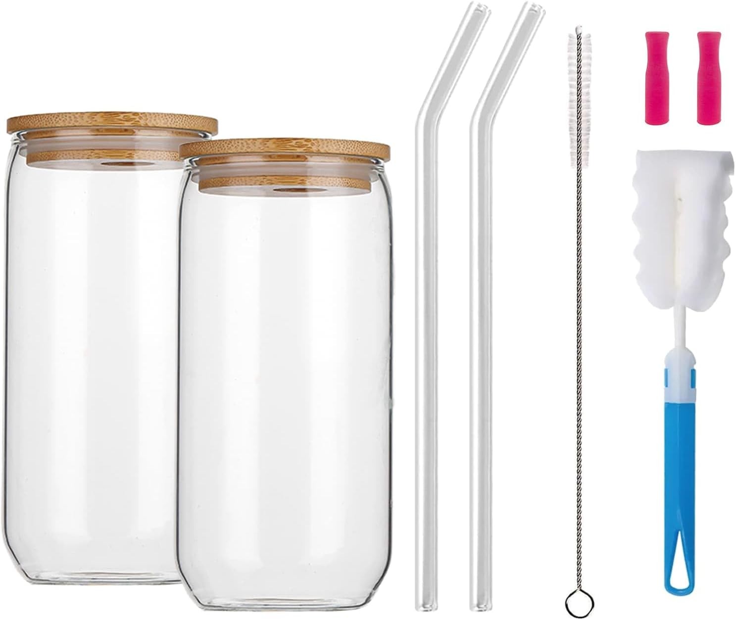 17OZ Glass Cups with Bamboo Lids and Glass Straw, Reusable Can Shaped Drinking Glasses with Lids and Straws & Brush,Wide Mouth Mason Jar Glass Cups for Smoothies, Tea, Cola, Juice, Soda (2 Pack)